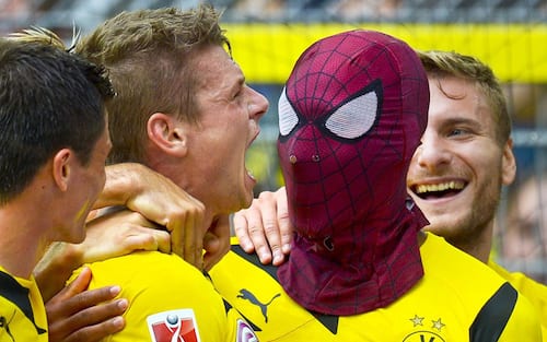 … e Aubameyang, supereroe della Bundesliga: qui in versione Spiderman