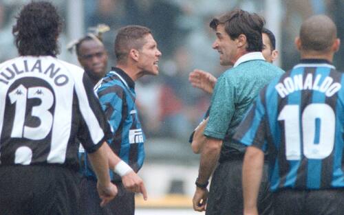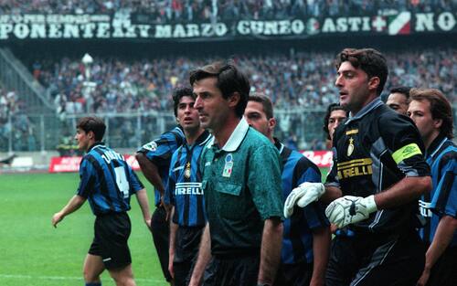 Il 26 aprile 1998, si gioca al Delle Alpi il match-scudetto, valido per la 31esima giornata. L'Inter di Simoni insegue i bianconeri a una sola lunghezza. Del Piero porta in vantaggio i padroni di casa al 21', ma è nella ripresa che si consuma la storia, quando Ronaldo va giù in area dopo un contatto con Iuliano: l'arbitro Ceccarini lascia proseguire e, tra le veementi proteste nerazzurre, assegna un rigore alla Juve nell'azione seguente (parato). Il tricolore finirà, tra mille polemiche, alla Juve: da quel momento, nessun dirigente interista assisterà più alla sfida di Torino -