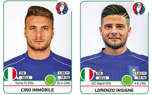 Immobile ed Insigne, avversari con le maglie di club, sono stabilmente compagni in Nazionale. Insieme partecipano a Euro 2016 e pur non essendo titolari nelle intenzioni del ct Antonio Conte, danno comunque il loro contributo. Lorenzo nei quarti di finale che gli Azzurri hanno perso contro la Germania si è preso la responsabilità di calciare (e segnare) il primo rigore della lotteria che, alla fine, premierà i tedeschi (Foto: Panini) -