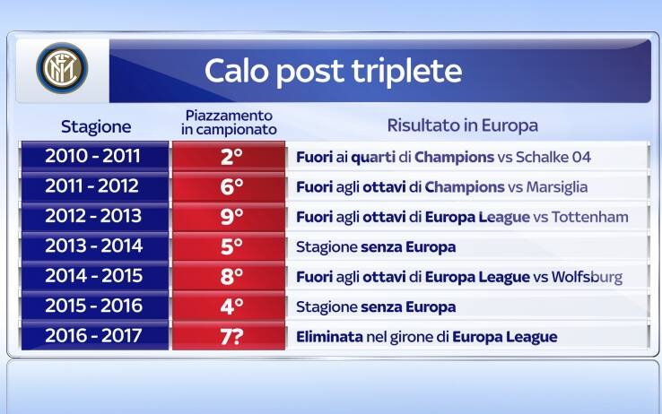 Dopo il Triplete, per la sesta stagione di fila, l’Inter non giocherà la Champions League. L'ultima gara nella massima competizione europea risale al 2010-2011: fuori ai quarti contro lo Schalke 04. Era un'altra Inter. Da quel momento nulla: per la terza nelle ultime sei stagioni, i nerazzurri sono quasi fuori anche dall’Europa League.