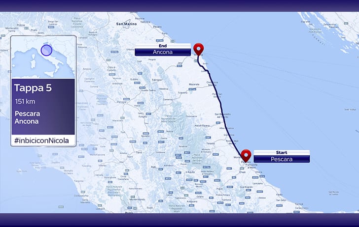 Dopo essere giunto a Pescara lunedì sera, Davide Nicola continua a pedalare per ripagare a pieno il fioretto: aveva promesso di raggiungere in bici Torino, da Crotone in caso di salvezza della sua squadra. E lo sta facendo, come un vero ciclista professionista. Pochi minuti prima delle 20 di martedì 13 giugno, si è conclusa una quinta tappa (da Pescara ad Ancona di 160 km) altamente simbolica. L'allenatore del Crotone ha pedalato a ritmi altissimi anche oggi, ed è arrivato al termine della frazione indossando... la maglia rosa. Gliel'ha consegnata il Commissario tecnico della Nazionale di ciclismo Davide Cassani che ha pedalato con lui nel tratto finale. Emozionanti e pieni di significato gli incontri. Dopo alcune pause, Nicola ha incontrato Marina Romoli, giovane promessa del ciclismo azzurro, campionessa in linea juniores nel 2006, travolta da un auto nel 2010 che l'ha costretta sulla sedia a rotelle. Dopo l'abbraccio, un piccolo "trasferimento" in auto verso Filottrano, la città di Michele Scarponi, altro ciclista ucciso da un incidente mentre si allenava in bicicletta. "Provando a percorrere la stessa strada che ha fatto lui, uno si immagina quello che può essere l'evoluzione che poi ha vissuto. E' emozionante vedere il tributo che la gente gli ha riconosciuto. Sono contento di essere venuto a rendergli omaggio".
