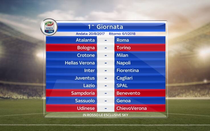 Non c’è campionato che si rispetti senza l’attesa di scoprire il calendario delle giornate. Negli studi di Sky Sport è stata svelata la prima giornata della stagione 2017-2018. I campioni d'Italia della Juventus ripartiranno in casa contro il Cagliari; il nuovo Milan va a Crotone mentre il Napoli di Sarri inizierà la stagione al Bentegodi contro il Verona. I big match della 1^ giornata sono Inter-Fiorentina e Atalanta-Roma. La prossima stagione prenderà il via nel weekend del 19-20 agosto e terminerà domenica 20 maggio. La nuova stagione si aprirà una settimana prima, il 13 agosto, per la Supercoppa che all'Olimpico di Roma vedrà di fronte Juventus e Lazio in una 'rivincita' della recente finale di Coppa Italia, vinta dai bianconeri per 2-0. Nel prossimo campionato saranno tre i turni infrasettimanali: mercoledì 20 settembre, mercoledì 25 ottobre e mercoledì 18 aprile. Cinque le soste: quattro per gli impegni delle nazionali (3 settembre, 8 ottobre, 12 novembre e 25 marzo) e una quinta il 14 gennaio. Per la prima volta si giocherà anche in quella che era considerata la "pausa natalizia": la 18^ giornata si disputerà il 23 dicembre mentre la 19^ - che incoronerà i campioni d'Inverno - sarà il 30 dicembre, dividendo perfettamente a metà il girone d'andata (tutto nel 2017) e quello di ritorno (tutto nel 2018).