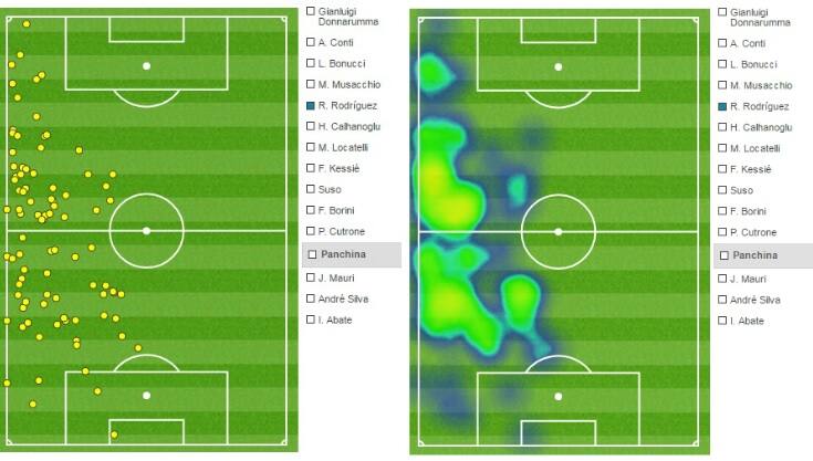 Tra le posizioni di Conti, Rodriguez e Suso, s'inserisce una scelta molto precisa da parte di Montella. Una retroguardia così sistemata, con Conti molto alto da una parte e Suso dietro le linee di pressione avversarie, agevola la conduzione di palla dei centrali, Bonucci e Musacchio, tipiche di una difesa a tre. Entrambi quando, dopo il giro palla e lo scivolamento avversario non proprio perfetto, trovano spazio davanti a sé lo attaccano in conduzione palla in modo tale da produrre una superiorità numerica nella zona centrale del campo e facilitare, attirando su di sé l'avversario, il movimento di Suso. Dalla grafica è evidente come entrambi (zona rossa nella trequarti avversaria) giochino molte volte oltre la linea di metà campo.