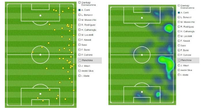 Teoricamente due laterali con le stesse caratteristiche e con gli stessi obiettivi tattici, identici per entrambe le corsie, in una difesa studiata per essere costantemente a quattro. E, invece, ci sono delle differenze sostanziali nel modo di giocare dei due: condizionanti rispetto a quella che è l'idea di partenza, almeno visiva, sul campo, di una difesa schierata con quattro giocatori. Nella prima costruzione del Milan, Conti è il laterale che si "alza" di più, spesso sulla linea dei centrocampisti, molte volte, ad azione già avanzata, oltre. La grafica lo dimostra in maniera molto evidente laddove sono evidenziate le zone di gioco dell'ex atalantino. A conferma di ciò anche tutti i primi controlli effettuati da Conti: posizione molto aperta (quasi sulla linea laterale) e molto alta (in costante spinta offensiva).