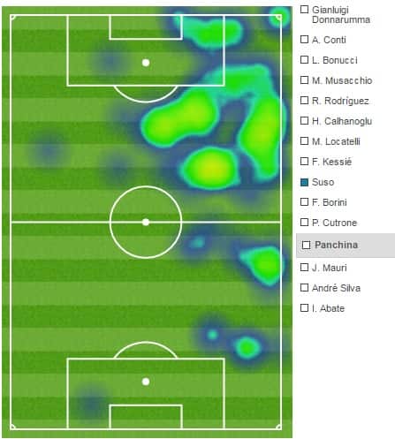 La scelta di tenere Conti molto alto durante la prima costruzione genera conseguenze non indifferenti nello sviluppo della manovra, nella gestione del pallone e nella preparazione alla finalizzazione. Conti in proiezione offensiva, di fatto, "spinge" Suso verso il centro. Lo spagnolo, quando non riceve palla largo va a giocare nel mezzo dietro la seconda linea di pressione dell'avversario (i centrocampisti) generando, in questo modo, quello che viene definito un vantaggio posizionale (guadagnare campo alle spalle degli avversari). Da lì Suso decide cosa fare, se aprire ancora il gioco da una parte (spesso lo fa a destra) oppure se attaccare la linea difensiva da posizione centrale.