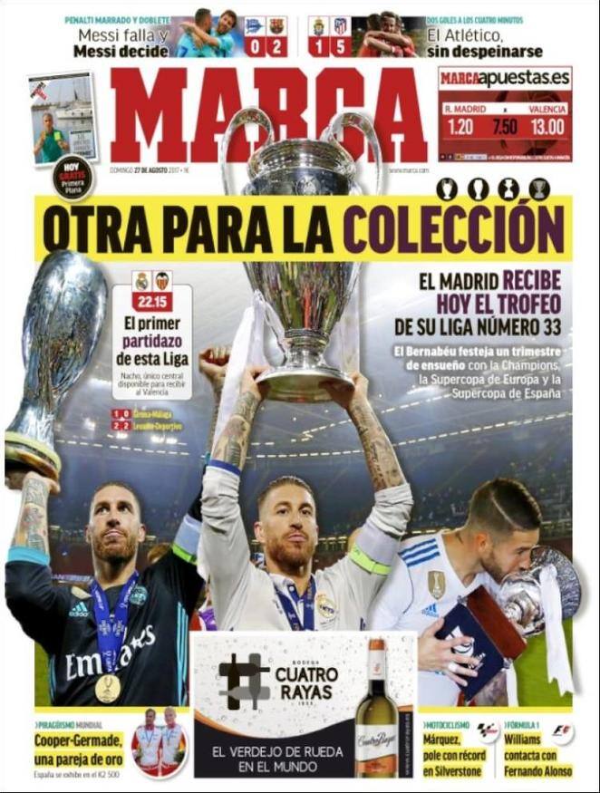 "El Real recibe la Liga". Questo il titolo di Marca, coi Blancos che oggi riceveranno il 33esimo trofeo prima della partita. "Otro para la coleccion". Sport, invece, parla di Messi e del successo del Barcellona sull'Alaves (2-0, doppietta della Pulga e rigore sbagliato in avvio). L'Equipe, infine, titola sul big match di Ligue 1 tra Monaco e Marsiglia, Falcao e Mandanda "on fire".