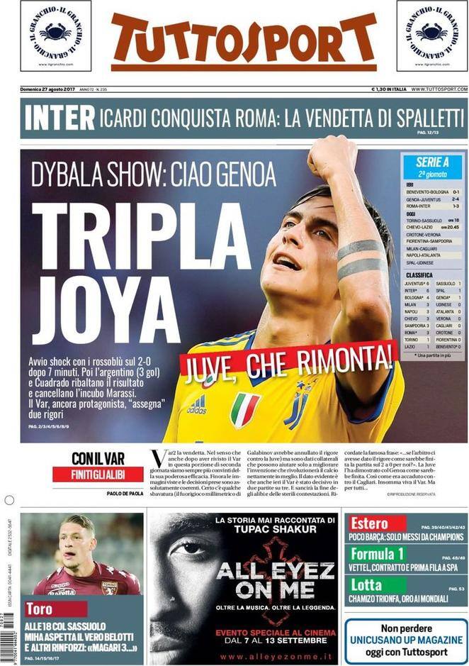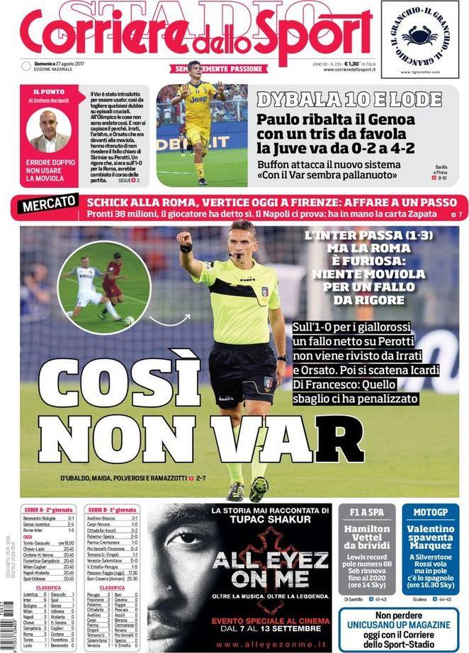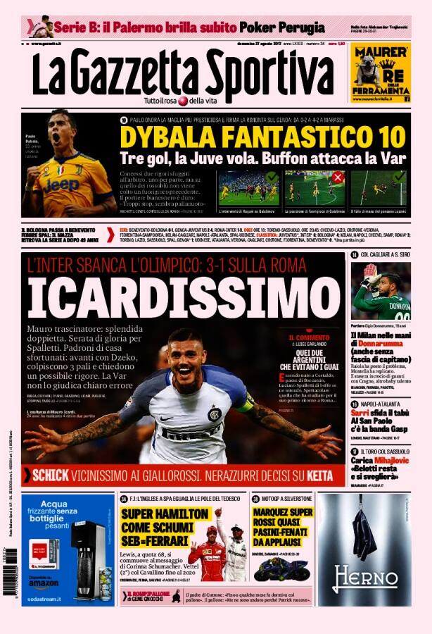 Da Icardi a Dybala, fino alla Var. Le prime pagine dei giornali danno spazio alla seconda giornata di Serie A "accantonando" per un attimo il mercato. "Icardissimo!", titola la Gazzetta. Maurito fa doppietta all'Olimpico e ribalta la Roma per 3-1, vittoria in rimonta per l'Inter. Tuttavia, i giallorossi protestano per un fallo da rigore non dato e neanche giudicato dalla Var. "Roma furiosa" dice il Corriere dello Sport, coi padroni di casa sfortunati: prima il vantaggio con Edin Dzeko, poi tre pali. Infine, la rimonta dell'Inter con lo show di Mauro Icardi. Sfortunati. Dall'Olimpico a Marassi, Dybala fa il fenomeno e segna una tripletta per la rimonta della Juve: "Dybala fantastico" dice la Gazzetta. E la Juve vola. Anche Gigi Buffon, però, ha qualcosa da ridire sulla Var: "Troppi stop, sembra pallanuoto". Pareri contrastanti sulla tecnologia.