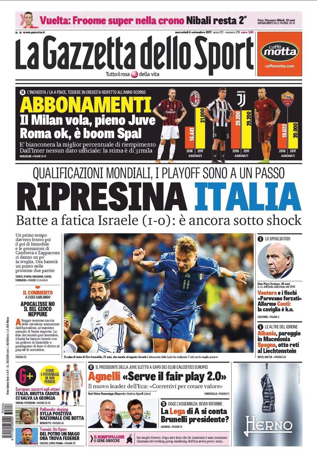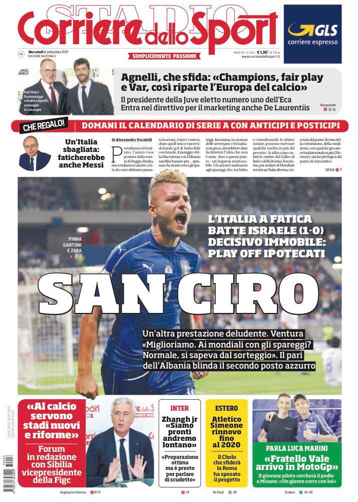 "Ciro Immobile salva l'Italia e ipoteca i playoff". E' questo il senso delle prime pagine dei principali giornali sportivi: brutta gara contro l'Israele, ma alla fine ci pensa Ciro. 1-0. "Ripresina Italia" titola la Gazzetta dello Sport, ormai i playoff sono a un passo: "E' ancora sotto shock". La sconfitta per 3-0 contro la Spagna fa ancora male agli azzurri. Fischi a Ventura: "Sembravano forzati" dice il giornale. Capitolo avversarie: la Spagna - come prevedibile - fa 8 reti al Liechtestein, mentre l'Albania pareggia in Macedonia e dice praticamente addio alla corsa per il prossimo Mondiale. Poi, al di là dell'Italia, una parentesi sugli abbonamenti: il Milan vola, la Juventus fa il pieno e la Roma è ok. Boom della Spal, neo promossa in Serie A.