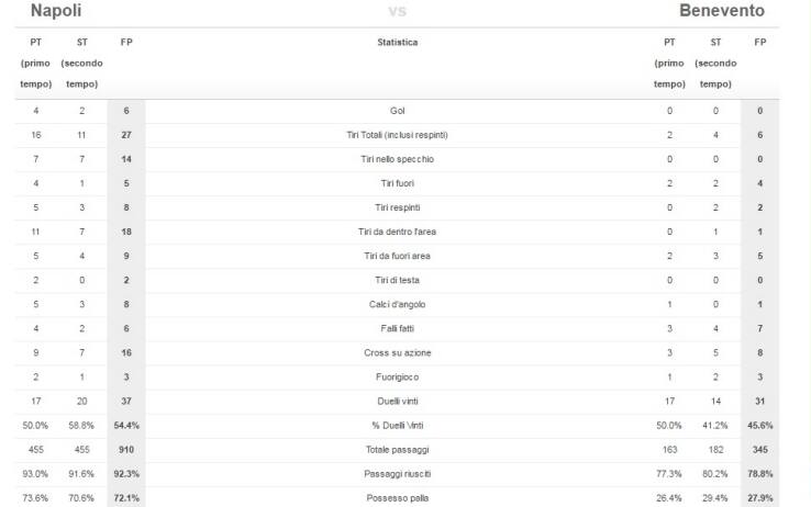Tutto troppo facile per i ragazzi di Sarri che al San Paolo chiudono la pratica Benevento in appena 32' minuti con i gol di Allan, Insigne, Mertens e Callejon. Nella ripresa altri due gol di Mertens, entrambi su rigore. Con questo successo il Napoli raggiunge Inter e Juventus in testa alla classifica con 12 punti in 4 gare e il miglior attacco della Serie A con 15 reti