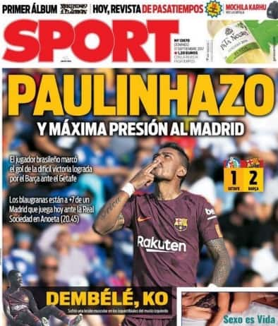 In Spagna largo spazio alla vittoria in rimonta del Barcellona sul Getafe: "Paulinhazo", sottolineano i quotidiani catalani Sport e Mundo Deportivo. Marca allerta il Real: "Pericolo!". La pressione sui ragazzi di Zidane ora si fa forte. As apre con la notte speciale dell'Atletico Madrid dopo l'inaugurazione del nuovo stadio: il Wanda Metropolitano. In Inghilterra, i temi del momento sono sicuramente la nuova sconfitta del Crystal Palace, nonostante il neo allenatore Roy Hodgson e i sei gol del Manchester City al sabato. In attesa della sfida tra Manchester United ed Everton.