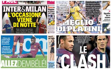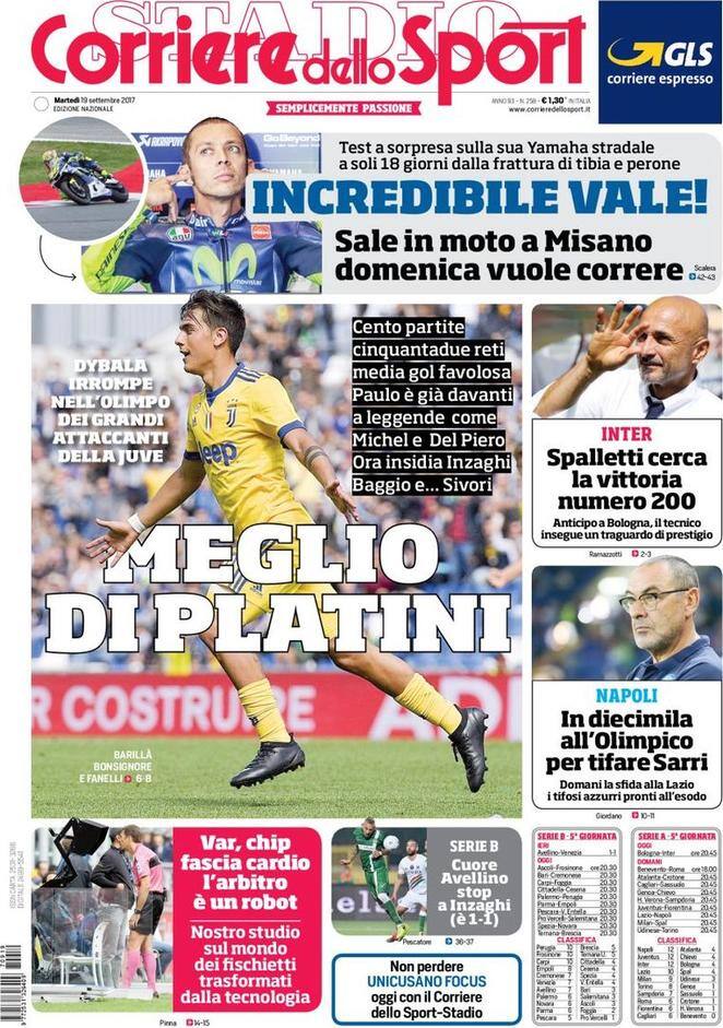 Giornata di campionato, con il primo infrasettimanale della stagione pronto a cominciare. L’anticipo del martedì vedrà protagonista l’Inter, che a Bologna cerca il quinto successo consecutiva della stagione: per Spalletti può essere la 200esima vittoria in carriera da allenatore. “Inter e Milan: l’occasione vien di notte. Sette vittorie in otto partite, non accadeva da 15 anni. Domani Montella contro la SPAL: obiettivo 4º posto”, scrive in prima pagina La Gazzetta dello Sport. Mercoledì, tra le altre, in campo anche la Juventus, forte di un Dybala in forma strepitosa: “Paulo meglio di Platini”, titola il Corriere dello Sport. “Cento partite e 52 gol: media clamorosa per l’argentino, che è già davanti a due leggende come Michel e Del Piero. Ora insidia Inzaghi, Baggio e… Sivori”. Gazzetta rincara la dose: “Dybala re d’Europa: nessuno segna come lui nei cinque super tornei. In campionato viaggia a una media superiore a quella di Messi e Falcao”. Juve che ha scoperto anche Matuidi, già padrone del centrocampo: “Juventus, zitta e corri. L’esempio è Matuidi” scrive il quotidiano torinese Tuttosport. “I dodici punti conquistati nelle prime gare non bastano e Allegri chiede al gruppo di emulare il comportamento del francese”. Anche il Napoli pronto a continuare la sua marcia vincente in A: "In 10.000 all’Olimpico a tifare Maurizio Sarri”.