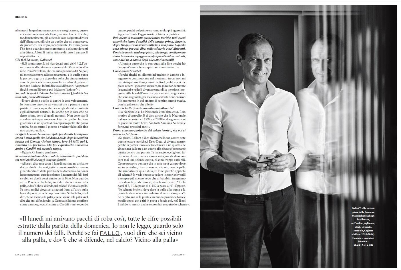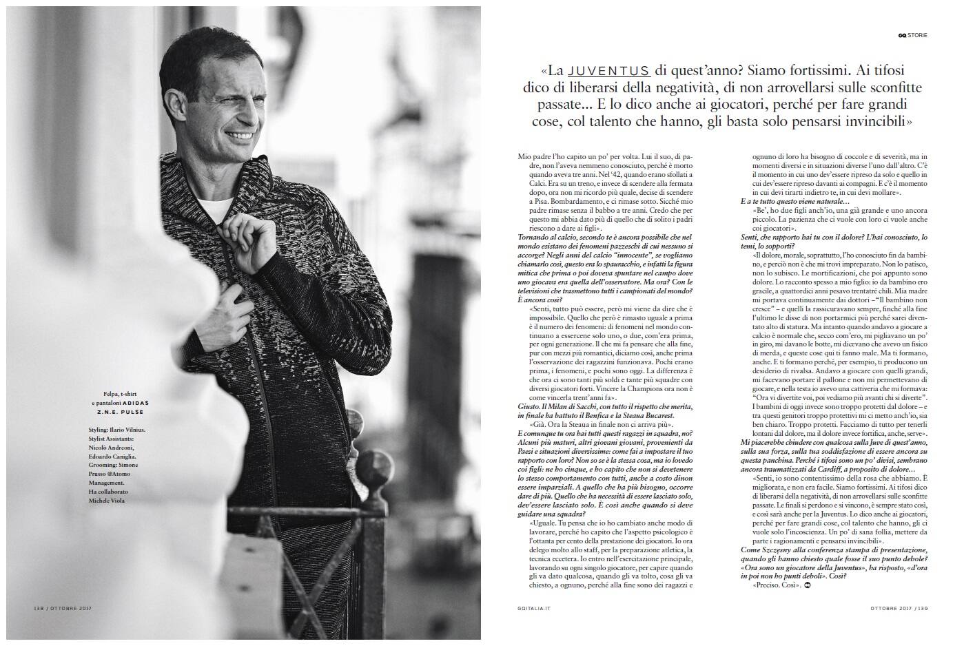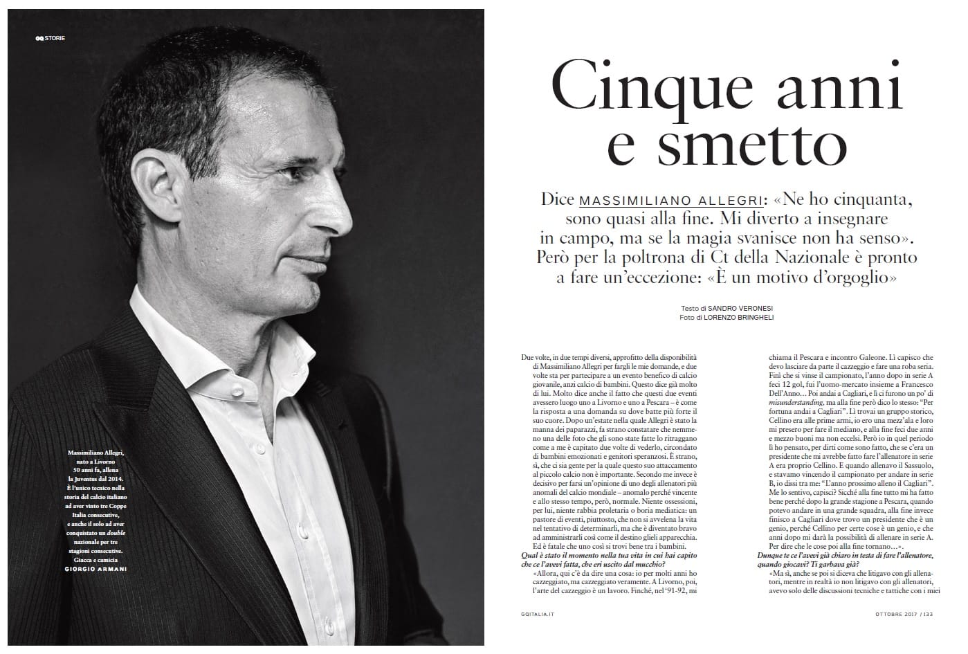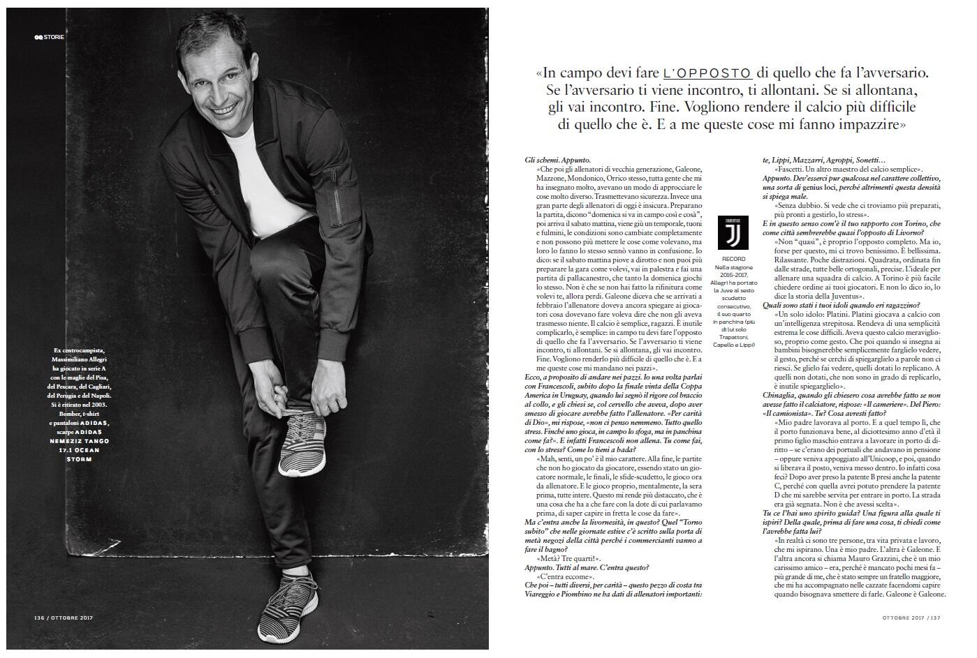 "Tra cinque o sei anni smetto. Perché finché mi diverto ad andare in campo e insegnare io continuo, ma nel momento in cui non mi divertirò più smetterò, e avrò risolto il problema. A me piace vedere i giocatori crescere, mi piace far debuttare i ragazzini e vederli diventare grandi. A me piace insegnare. Alla fine dell’anno mi piace vedere dei giocatori che sono migliorati, per me è una soddisfazione enorme. Nel momento in cui smetto di sentire questa magia, non ha più senso che alleni". Così parla Massimiliano Allegri nel numero di ottobre di GQ. Il mensile diretto da Giuseppe De Bellis ha incontrato l'allenatore della Juventus due volte: una nella sua abitazione torinese per il servizio fotografico di Lorenzo Bringheli, una nella sua città d’origine, Livorno, per l’incontro con lo scrittore premio Strega Sandro Veronesi. Un’intervista lunga e profonda, in cui Allegri apre le porte del suo mondo e fa conoscere le sue idee sul calcio e non solo.