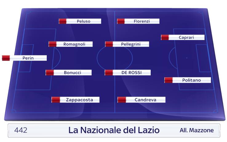 Perin; Zappacosta, Bonucci, Romagnoli, Peluso; Candreva, De Rossi, Pellegrini, Florenzi; Politano, Caprari