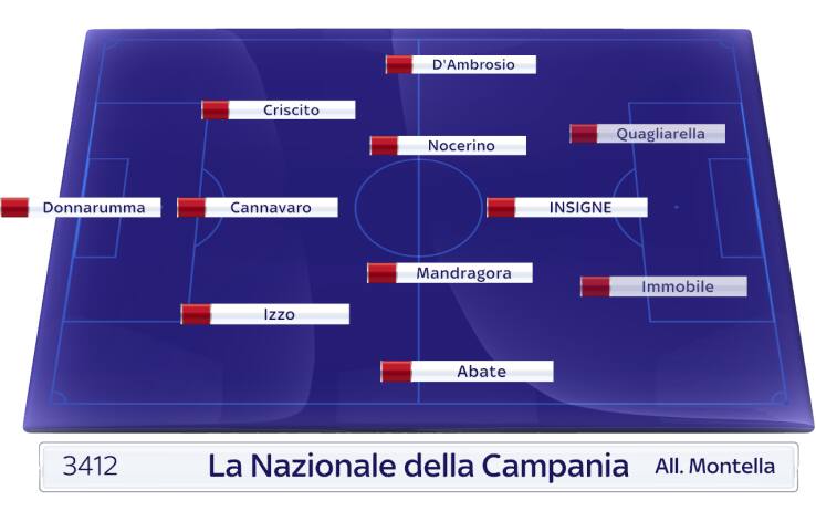 Esperienza, gioventù e talento: c’è un po’ di tutto nella possibile nazionale campana che può schierare giocatori del calibro di Donnarumma, Insigne e Immobile. Forse mancherebbe qualcosa a centrocampo ma la Campania non sfigurerebbe in campo internazionale. Ad allenarla potrebbe essere Vincenzo Montella, nato a Pomigliano D’Arco.