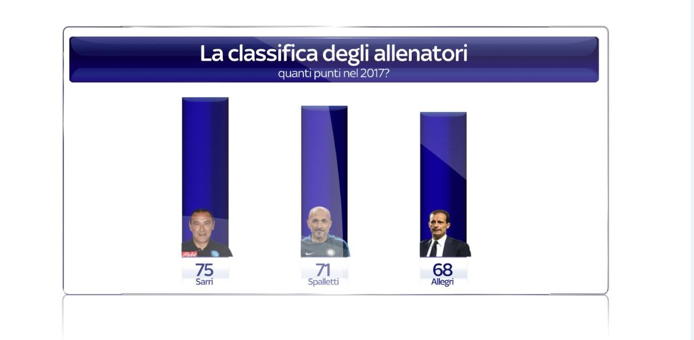 Serie ALa classifica punti del 2017 incorona... Maurizio Sarri! L'allenatore del Napoli è al primo posto con 75 punti nonostante non abbia vinto trofei, poi Spalletti (Roma e Inter). Infine Max Allegri, reduce dallo Scudetto con la Juve