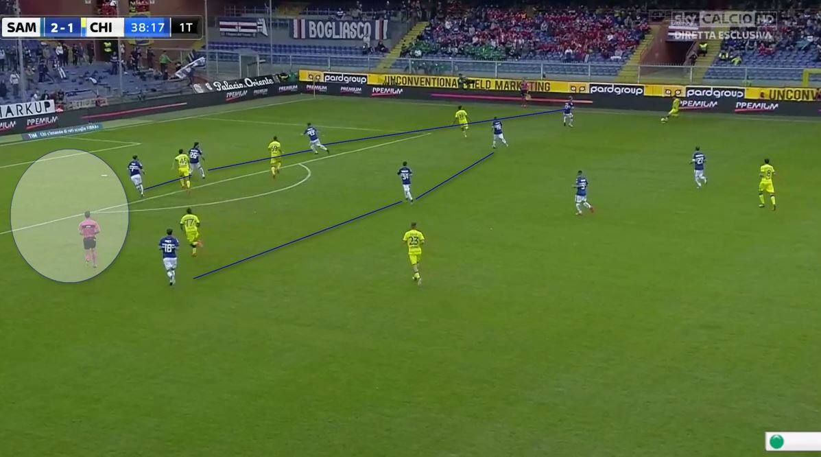 Strinic è costretto a uscire largo dalla posizione interna della mezzala davanti a lui. Sul cross da sinistra del Chievo il terzino destro blucerchiato lascia tanto spazio alle sue spalle. I centrocampisti non si abbassano a difendere dentro l’area.
