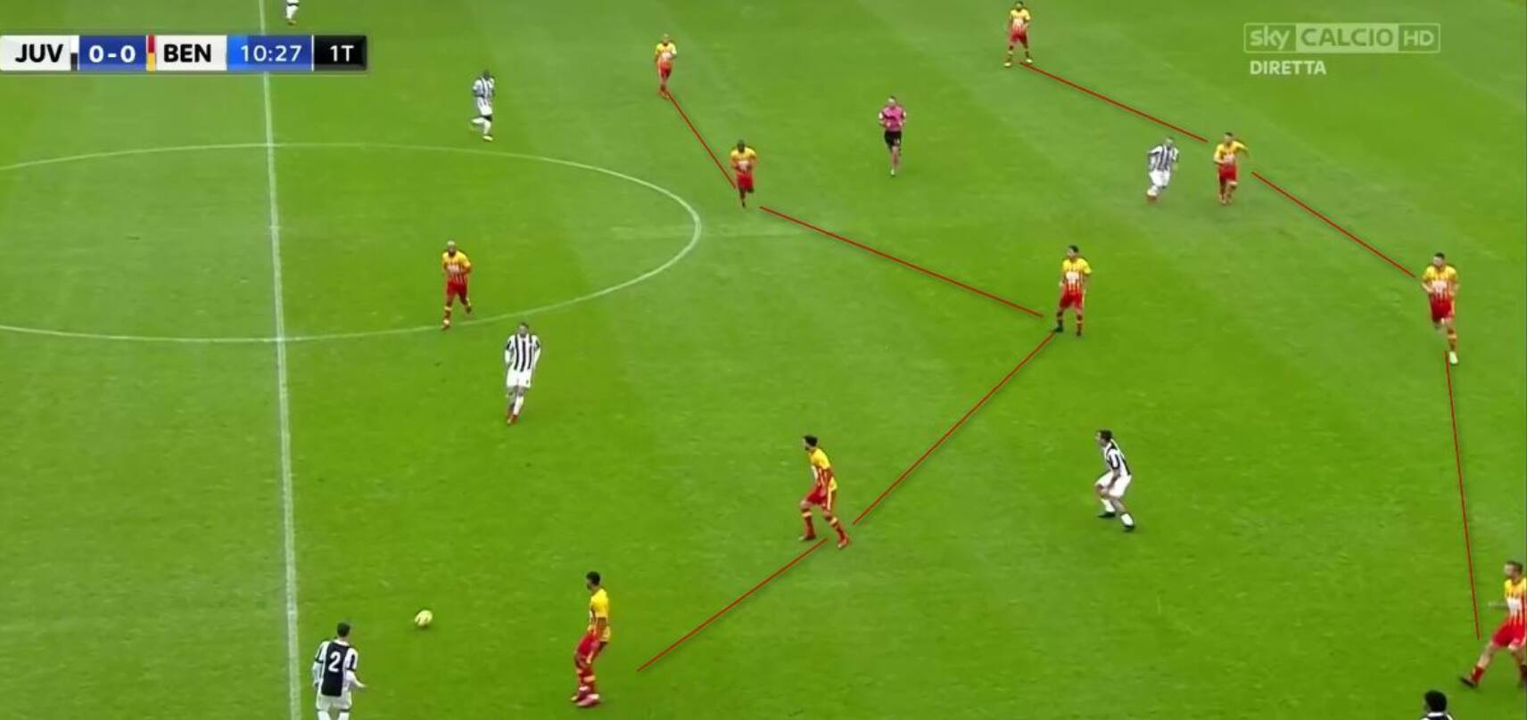 Contro la Juventus, paradossalmente, il Benevento è sembrato molto più convinto delle proprie possibilità rispetto alle ultime esibizioni. Ha affrontato la partita senza indossare a priori i panni della vittima sacrificale e ha fatto una figura migliore di altre molte squadre di serie A allo Juventus Stadium. Oltre che su quello mentale, la mano di De Zerbi è già pesantemente intervenuta sull’atteggiamento tattico della squadra. Contro la Juve il tecnico ha impostato un 3-4-3 fluido che in fase di non possesso virava verso un 4-5-1 con lo scivolamento delle mezzepunte Ciciretti, sull’esterno di destra, e Cataldi, al fianco sinistro del mediano Viola.