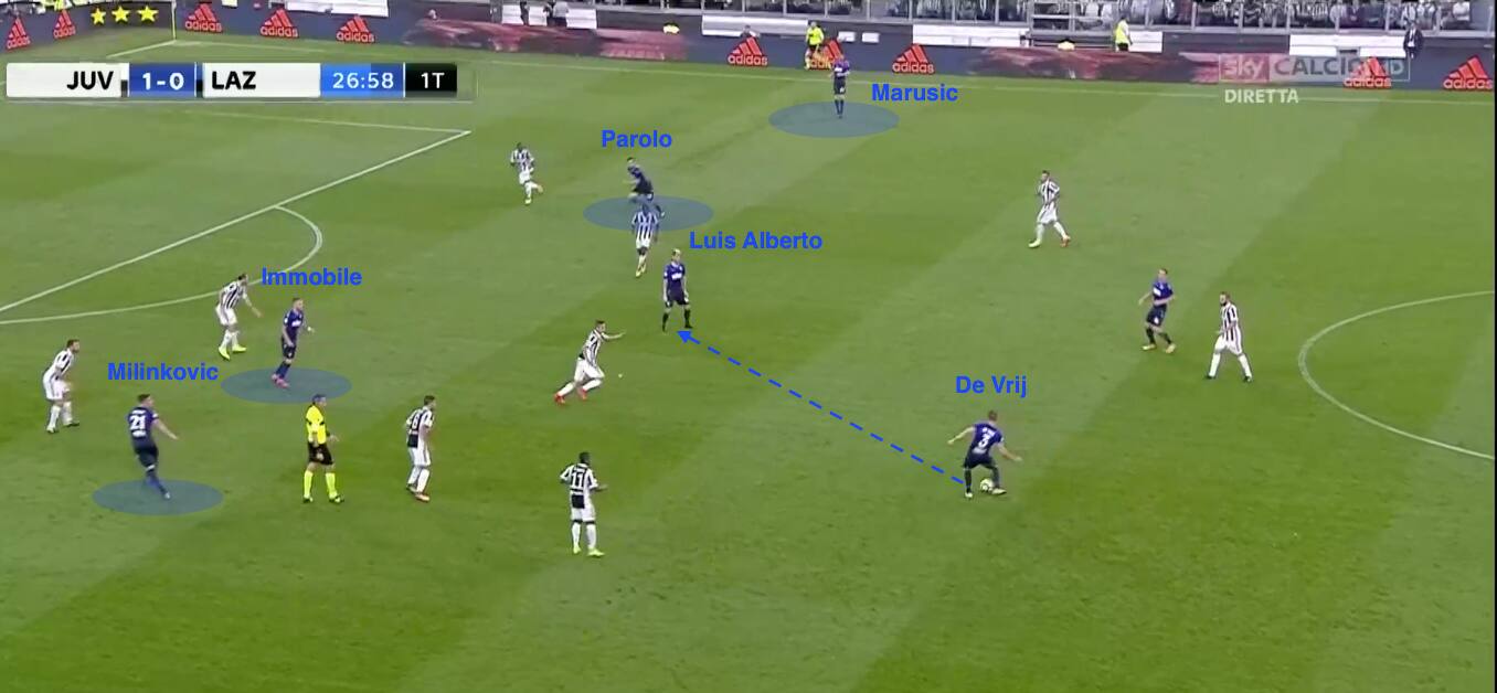 La salita di Luis Alberto e De Vrij sovraccarica il sistema di marcaure della Juventus, che è già in potenziale 4 contro 3 in difesa.