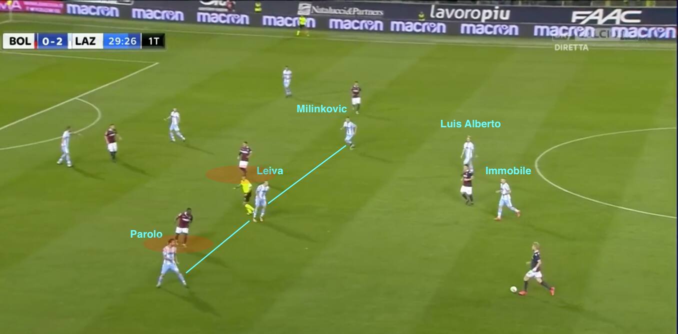 La coperta troppo corta del centrocampo della Lazio con il 3-5-2: se Parolo e Milinkovic-Savic si allargano le ricezioni tra le linee rimangono scoperte.