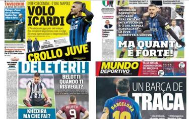Vediamo ora come i quotidiani sportivi nazionali hanno reagito al weekend di Serie A appena concluso. “Volo Icardi, crollo Juve” scrive in prima pagina La Gazzetta dello Sport: “Inter seconda a -2 dal Napoli: l’Atalanta regge un tempo, poi decide l’argentino con due colpi di testa. Super Samp: tris da favola, campioni a -4. E Chiellini lancia l’allarme”. Il Corriere dello Sport celebra l’attaccante argentino dell’Inter: “Ma quanto è forte! Splendida doppietta di Icardi, piegata l’Atalanta”. Sulla Juve, invece: “La Samp mette alle corde i bianconeri, che perdono contatto col Napoli. Signora battuta, Allegri la scuote”. Doppio crollo a Torino, di cui si parla in prima pagina su Tuttosport: “Deleteri!” scrive il quotidiano inserendo le immagini di Khedira e Belotti in copertina. “Khedira ma che fai? Si ferma a protestare e consente alla Samp di segnare il terzo gol decisivo. Belotti quando ti risvegli? Il Gallo gioca male, non segna e sbaglia il rigore vittoria. Poi si scusa con tutti”.
