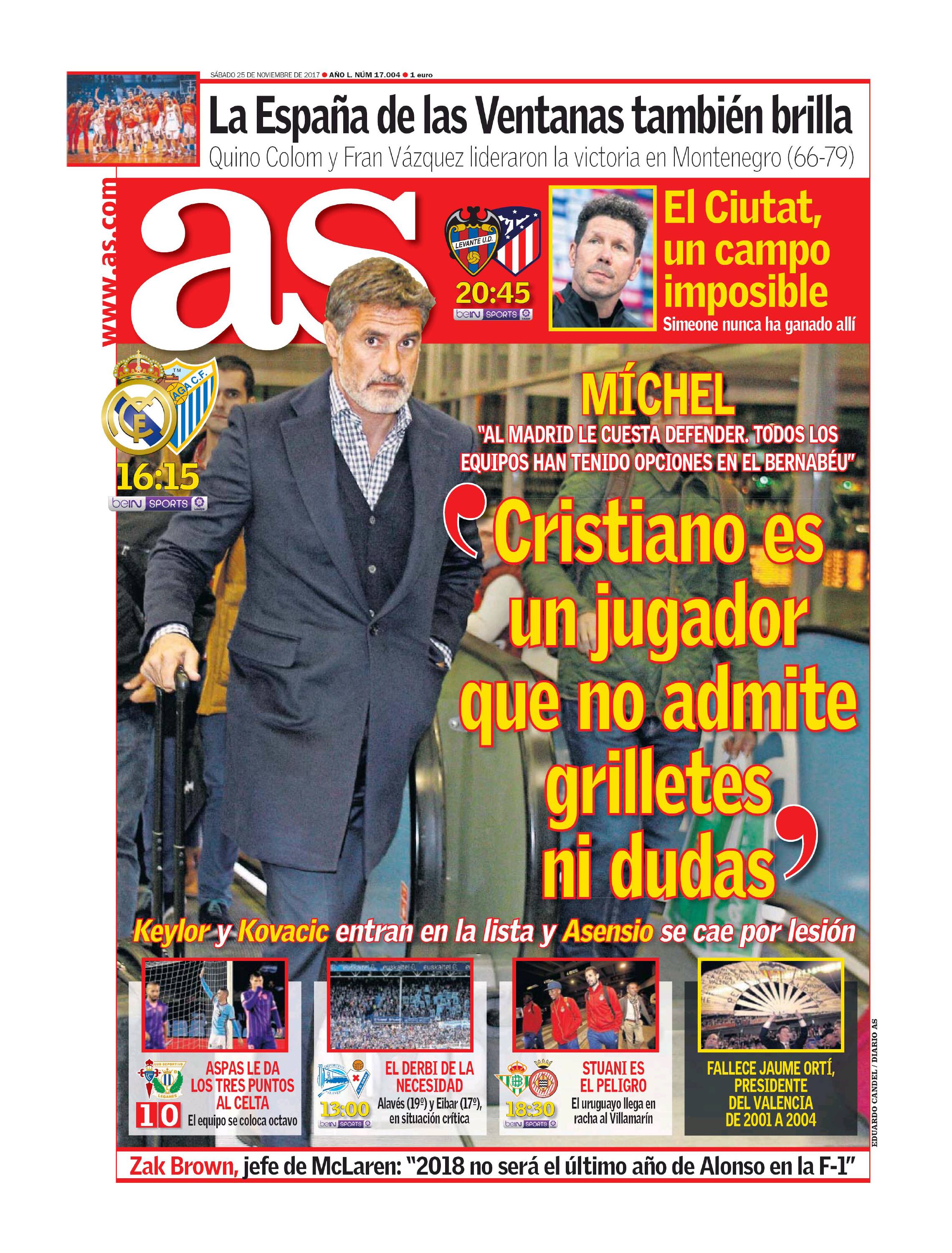 All’indomani della consegna a Leo Messi della sua quarta Scarpa d'Oro, si torna a far sul serio anche in Liga. Lionel Messi e il suo Barcellona saranno di scena a Valencia e il Mundo Deportivo in prima pagina sottolinea le parole dell’argentino: "Andiamo a Valencia con molto entusiasmo. Ogni giorno di più mi godo il fatto di essere calciatore". In taglio basso anche un piccolo estratto di una intervista a Mario Kempes: "Leo Messi è lo scudo di questo Barcellona". Da un quotidiano catalano ad uno madrileno: AS dà spazio alle parole di Michel in conferenza: "Cristiano è un giocatore di cui non si può dubitare". In taglio alto anche l'altra squadra madrilena, l’Atletico di Madrid di scena sul campo del Levante, uno stadio in cui il Cholo Simeone non ha mai vinto. L’Equipe invece focalizza l’attenzione sull’attesissimo big match tra Monaco e Paris Saint-Germain in programma domani sera con fischio d’inizio alle ore 21.