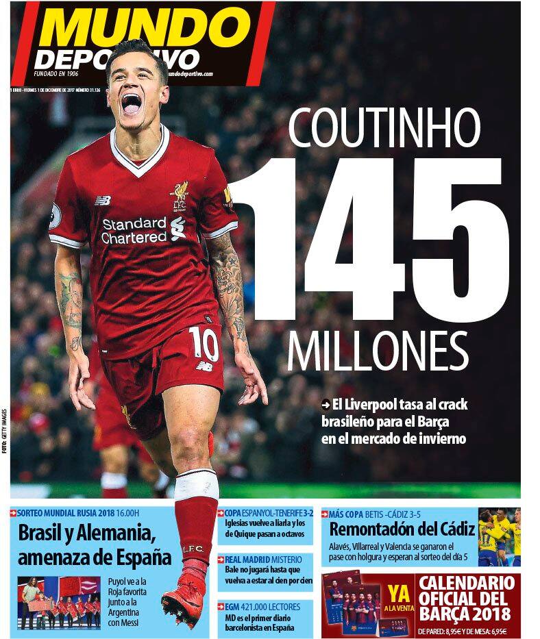 E proprio del sorteggio per Russia 2018 si occupa anche la prima pagina di Marca che titola "Non c'è un nemico inferiore. Lopetegui: 'Ci toccherà il gruppo più forte'. Argentina, Germania e Brasile i rivali meno desiderati". Simile la riflessione che fa AS dedicata anche in questo caso al destino della Nazionale spagnola nel prossimo mondiale: "Sorteggio tra i coccodrilli" scrive il quotidiano della capitale. Per quanto riguarda invece Mundo Deportivo, la prima pagina è dedicata al mercato, con un presunto rilancio del Barcellona per arrivare Coutinho offrendo al Liverpool 145 milioni di euro. I quotidiani inglesi - come il Mirror e non soltanto - dedicano le prime della loro sezione sport al ritorno in panchina di Sam Allardyce, nuovo allenatore dell'Everton.