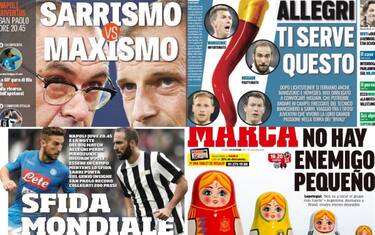 Prime pagine italiane tutte dedicate a Napoli-Juventus, tra le parole di Allegri, gli assenti e la formazione di Maurizio Sarri pronta a vivere una super notte in un San Paolo da record. All'estero occhi sul sorteggio per Russia 2018, sul mercato e sul ritorno in panchina di Allardyce