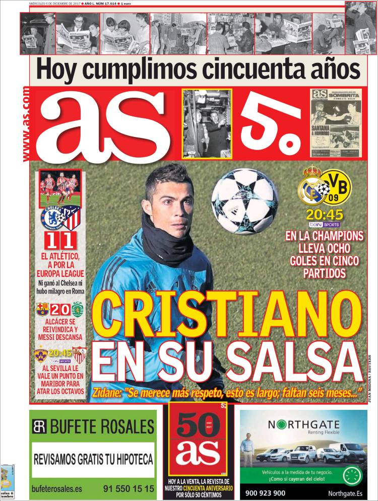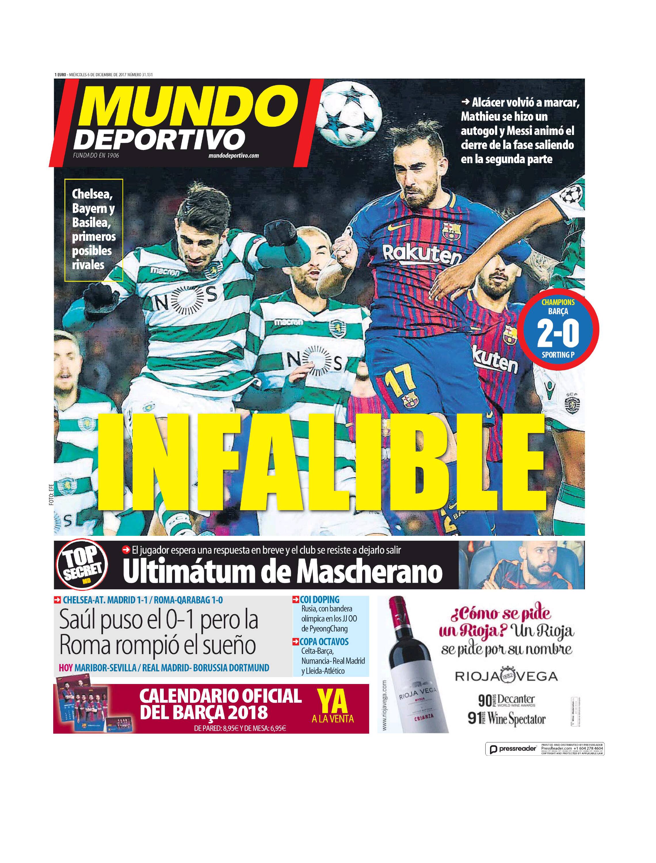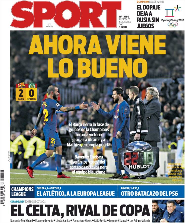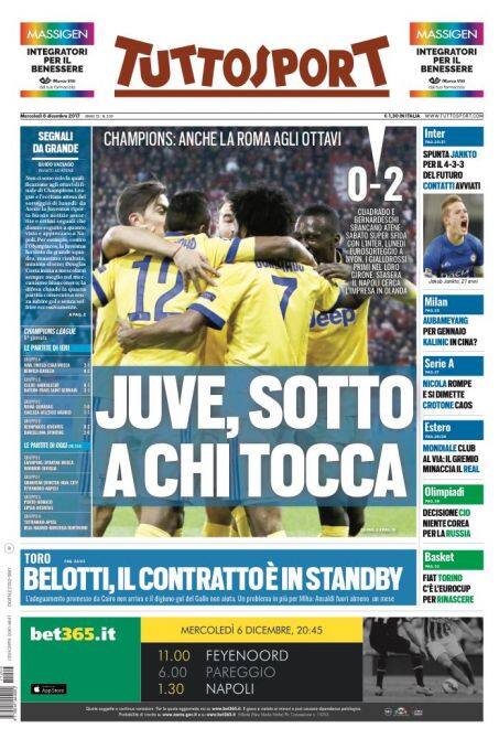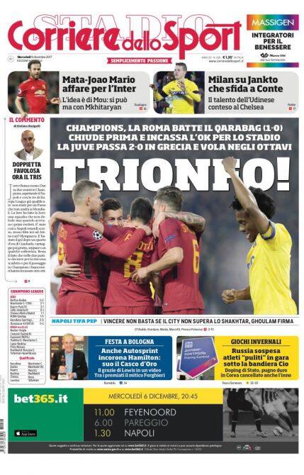 Missione compiuta. Juventus e Roma non sbagliano e portano a casa la qualificazione agli ottavi di finale di Champions League. I bianconeri battono l'Olympiacos ad Atene e non devono così dipendere da nessun altro risultato, che comunque sarebbe stato loro favorevole (sconfitta dello Sporting a Barcellona); la Roma vince contro il Qarabag all'Olimpico e complice il pareggio di Stamford Bridge tra Chelsea e Atletico Madrid, strappa anche il primo posto ad Antonio Conte. Grande risalto al risultato delle due italiane sulle prime pagine dei quotidiani sportivi italiani: "Juve sì, missione compiuta. Vai Roma, è primo posto", il doppio titolo della Gazzetta dello Sport, che auspica l'en plein: "Il Napoli prova a regalarci il tris sperando in Guardiola".