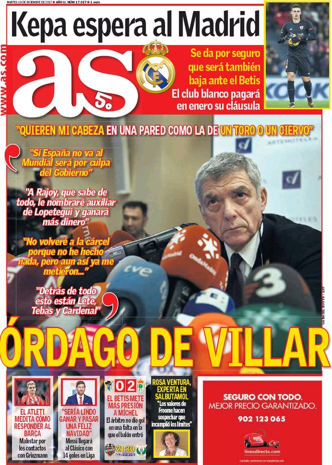 Calciomercato che inizia a entrare nel vivo anche all’esterno, non solo in Italia. L'Equipe parla di: "Affondo Barcellona per Griezmann. L'Atletico e il giocatore sono d’accordo per dirsi addio a fine stagione, con Griezmann che potrebbe proseguire la sua carriera nella Liga. La trattativa con il Barcellona è in stato avanzato". In Spagna tiene banco la vicenda Mondiale, As apre con le parole di Villar: "Vogliono la mia testa in una parete come fosse quella di un toro o di un cervo. Se la Spagna non va al Mondiale sarà per colpa del Governo. A Rajoy che sa di tutto, lo nominerei secondo di Lopetegui e guadagnerebbe di più. Non tornerò in carcere perché non ho fatto niente, anche se mi ci hanno fatto finire. Dietro tutto questo ci sono Lete, Tebas e Cardenal”. Marca invece esalta il talento di Messi: "La stella tra le stelle dei premi di Marca. Leo conquista il suo quarto Pichichi e il trofeo Di Stefano come miglior giocare della Liga 16/17. "Sarebbe bello salutare l’anno con una vittoria nel classico", dice l'argentino. Premiati anche Oblak, Aspas e Iniesta. Mendilibar e Garitano condividono il trofeo come miglior allenatore”.