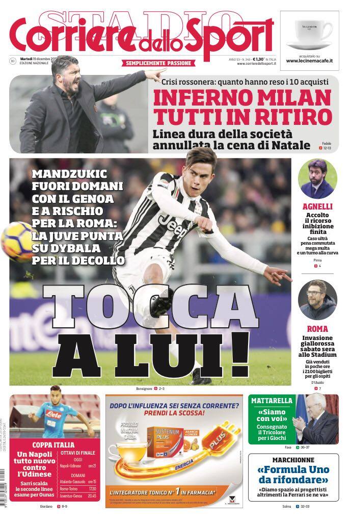 Dalle vicende di casa Milan a quelle decisamente più serene che riguardano la Juventus, impegnata domani sera contro il Genoa in Coppa Italia. "Tocca a lui", il titolo principale del Corriere dello Sport con riferimento a Paulo Dybala che tornerà titolare: "Mandzukic fuori domani con il Genoa e a rischio per la Roma, la Juventus punta su Dybala per il decollo”. Sguardo in casa bianconera anche da parte di Tuttosport: "Juventus felice anche senza la Joya. L'inserimento riuscito dei nuovi consente ad Allegri di tenere in panchina una serie incredibile di campioni. E pure Dybala può recuperare con calma la forma migliore per tornare fenomeno". Spazio poi al: "Caso biglietti-ultrà, la vittoria di Andrea", scrive sempre Tuttosport. La Gazzetta dello Sport sulla vicenda: "Agnelli sorride, pena già scontata. Chiusa la curva". "Agnelli: accolto il ricorso, inibizione finita”, scrive il Corriere dello Sport.