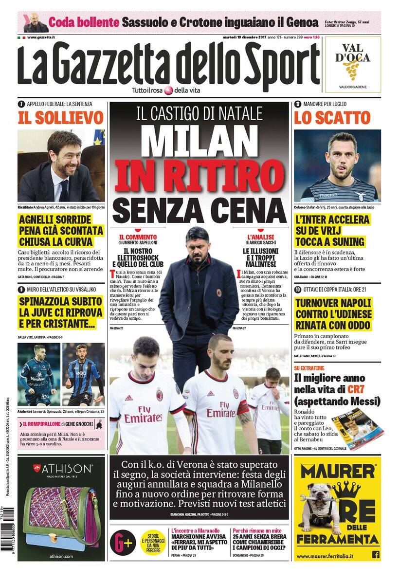 La delicata situazione vissuta dal Milan dopo la sconfitta con l'Hellas Verona, i primi movimenti in vista dell'ormai prossima sessione invernale di calciomercato, passando per la Coppa Italia che tra le altre vedrà scendere in campo anche Napoli e Juventus: sono questi i temi principali presenti quest'oggi nelle prime pagine dei principali quotidiani sportivi nazionali. "Milan in ritiro senza cena. Il castigo di Natale", titola la Gazzetta dello Sport che poi aggiunge: "Con il ko di Verona è stato superato il segno, la società interviene: festa degli auguri annullata e squadra a Milanello fino a nuovo ordine per ritrovare forma e motivazione. Previsti nuovi test atletici". Il Corriere dello Sport dedica si occupa delle vicende rossonero nel taglio alto: "Inferno Milan, tutti in ritiro. Linea dura della società, annullata la cena di Natale”. Tuttosport parla invece di: "Fallimento Milan. Gattuso ordina il ritiro: salta la festa di Natale".
