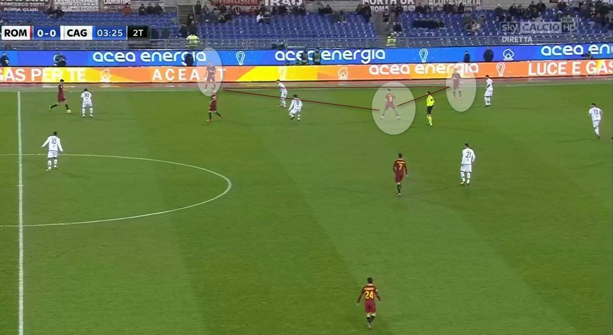 Buona parte del destino della partita di stasera sarà definito dallo scontro tra il pressing della Roma e la capacità della Juventus di superarlo e consolidare la manovra offensiva con il palleggio. Le maggiori difficoltà strutturali del 4-3-3 di Di Francesco risiedono nella capacità di portare pressione sul mediano avversario, che richiede un’uscita asimmetrica che può aprire spazi alle spalle delle mezzali. L’unica volta in cui Di Francesco ha rinunciato al suo modulo di gioco è stato contro il 4-3-3 del Napoli, quando Nainggolan è stato spostato in posizione di vertice avanzato del triangolo di centrocampo rovesciato, con il compito di controllare il mediano Jorginho.