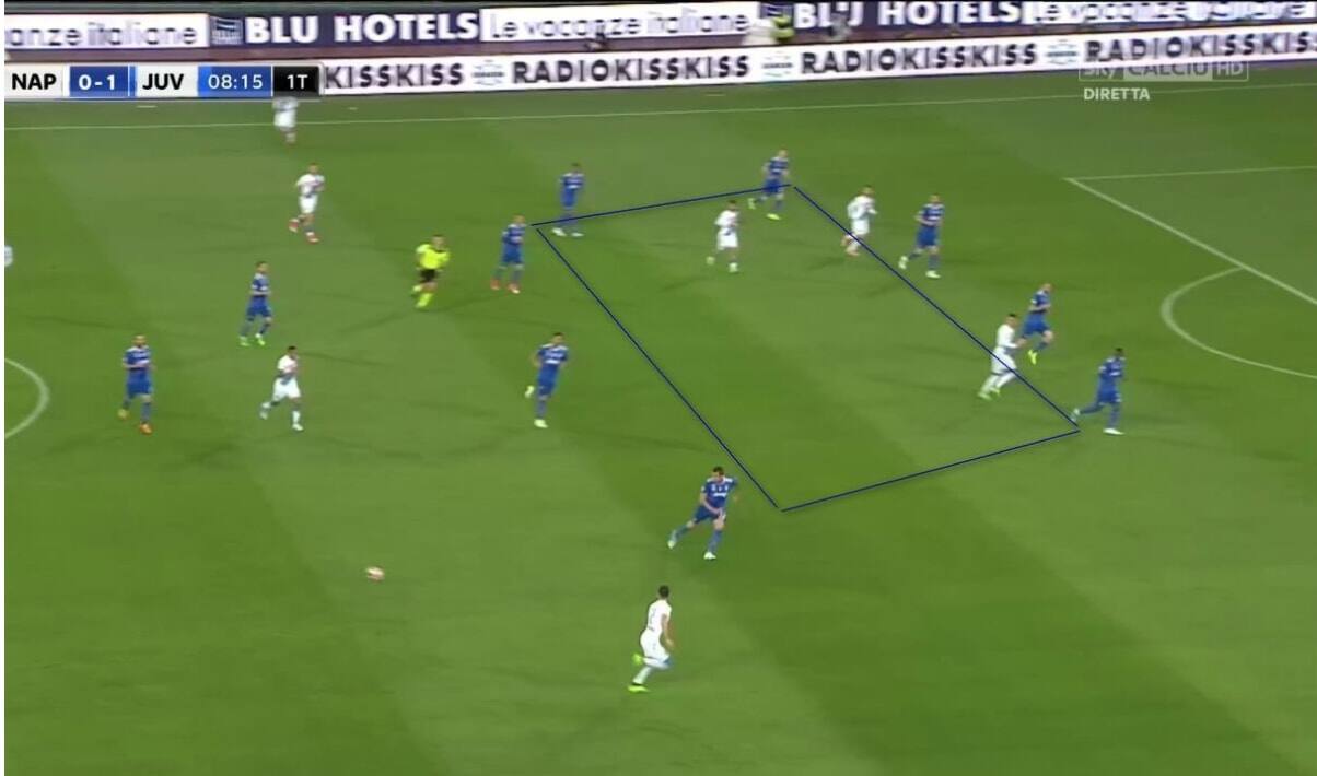 Sembrava l’inizio di una nuova strada tattica per i bianconeri, ma la partita di Napoli ha rimescolato di nuovo le carte. La Juventus ha adattato il modulo e la strategia di gioco alle caratteristiche della squadra di Sarri, schierandosi con un 4-4-2 stretto, corto e basso. L’idea era di negare il centro e la profondità alle trame palleggiate del Napoli, costringendolo a giocare per vie esterne, fuori dai flussi di gioco preferiti.