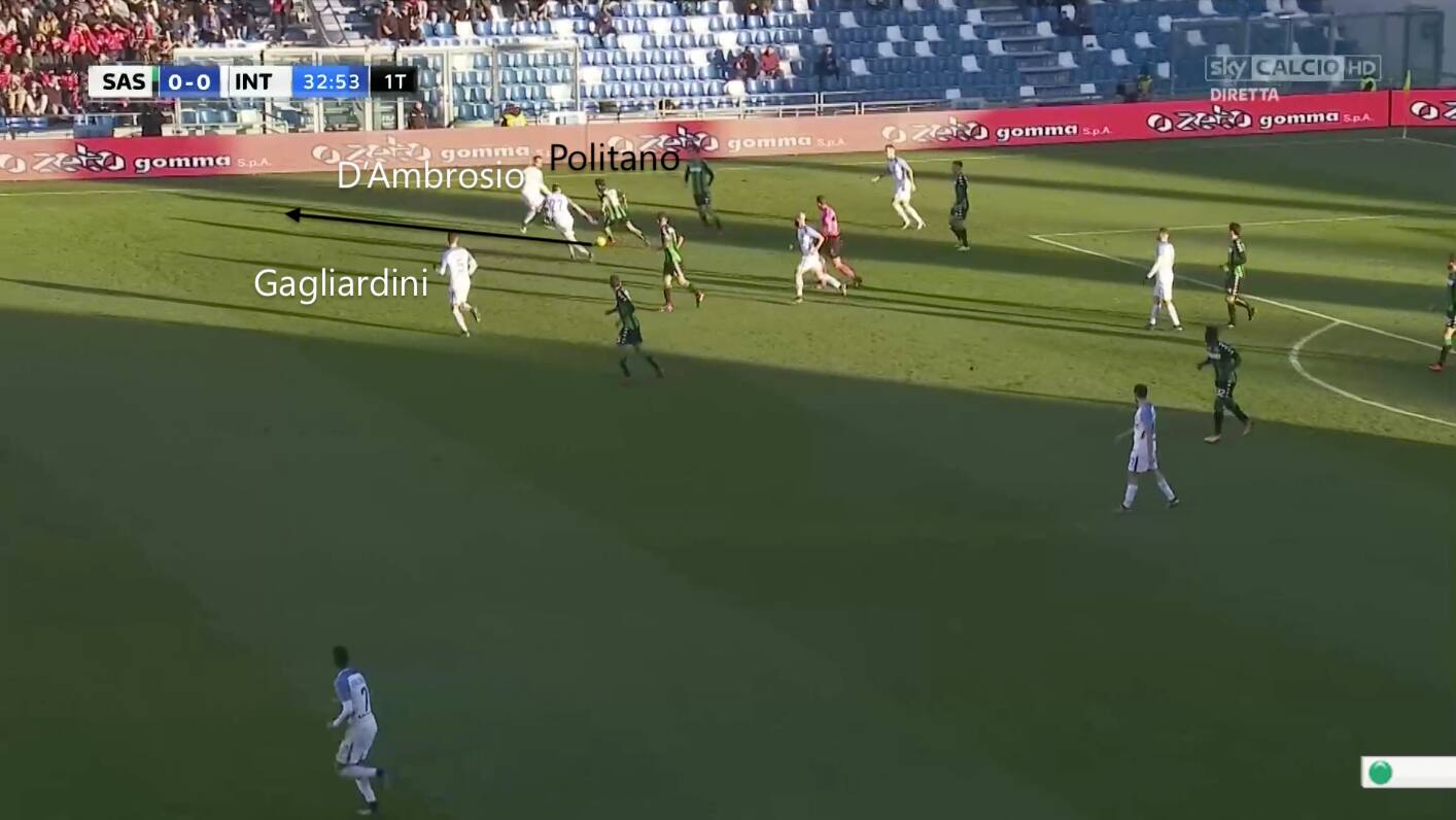 Se si guarda l’azione da cui nasce il gol del Sassuolo (nell’immagine qui sotto), si nota come D’Ambrosio affonda il tackle con troppa precipitazione, facendo diventare troppo facile per Politano saltarlo ed aprirsi così una prateria. Anche la posizione di Gagliardini è forse troppo avanzata, e troppo centrale, per riuscire ad offrire una copertura efficace al terzino. Così Politano si invola, con il volenteroso Brozovic che prova a stargli dietro, e riesce a crossare sul secondo palo dove Falcinelli si inserisce tra Skriniar e Cancelo.