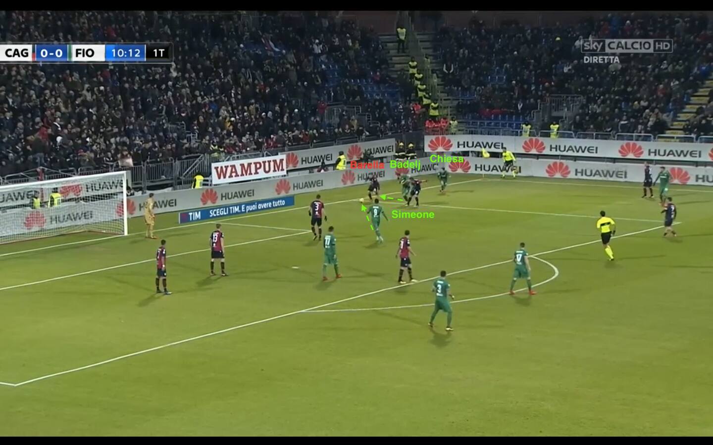 La riaggressione alta della Fiorentina soffoca il Cagliari: qui Barella è costretto a giocare dalla linea di fondo da Chiesa, Badelj e Simeone. Il giovane centrocampista del Cagliari si rifugerà da Cragno, che riconsegnerà con un rilancio casuale il pallone alla Fiorentina