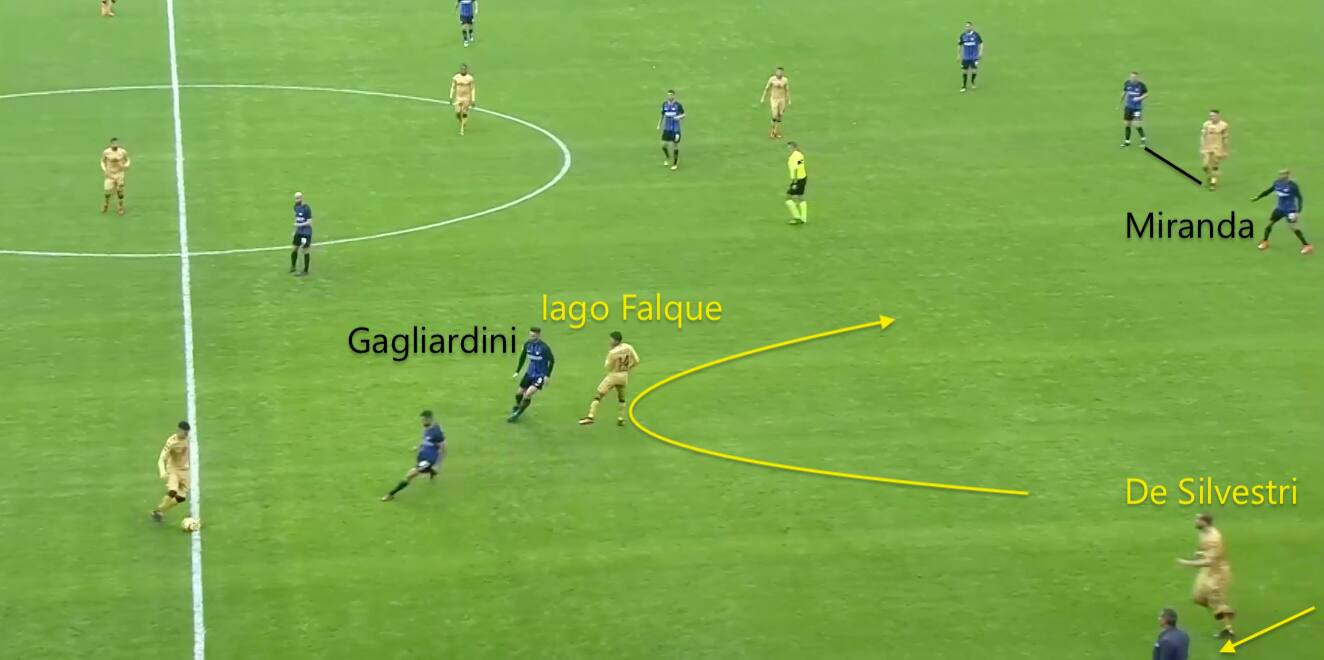 Anche se guarda il gol subito contro il Torino (nell’immagine qui sopra) quasi due mesi fa si nota come il fianco scoperto dell’Inter sia sempre lo stesso: in quel caso è il gioco a due tra De Silvestri e Iago Falque a costringere Nagatomo ad allargarsi e Gagliardini ad avanzare. Lo spazio che si viene a creare è incolmabile per Miranda, destinato a soccombere nell’uno contro uno con un giocatore brevilineo come Iago Falque. Si tratta di piccoli dettagli, ma che possono fare una grande differenza.