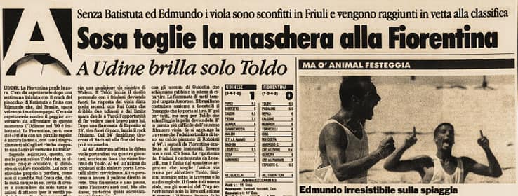 Senza cadere nella trappola della retorica e delle sliding doors, per i tifosi viola ci sarà sempre un prima e un dopo quel maledetto infortunio. Con il grande rammarico che nessuno saprà mai come sarebbe stato il dopo se… Possiamo dirvi invece come è andata realmente, quello sì. La domenica seguente Lazio e Parma pareggiano rispettivamente contro Cagliari e Bologna, ma per le inseguitrici - vittoriose mentre i viola facevano 0-0 con il Milan - è comunque un punto guadagnato, dato che la Fiorentina cade contro l’Udinese, battuta all’andata con un gol di Edmundo al 92°. Agguantata in classifica, perderà definitivamente il comando. Intanto Edmundo sfila al Sambodromo di Rio de Janeiro per la scuola di samba Salgueiro. E balla, come se dovesse saltare Costacurta.