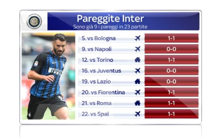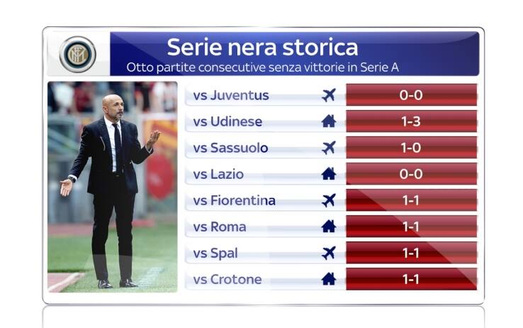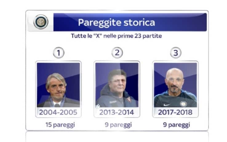 Con il pareggio casalingo contro il Crotone l'Inter ha eguagliato il record negativo di gare in campionato senza vittorie, 8. Un altro passo falso contro il Bologna domenica prossima vorrebbe dire per Spalletti stabilire un primato per nulla invidiabile. In questi due mesi di crisi la squadra nerazzurra ha palesato tante difficoltà in attacco, dove la media realizzativa dal 2.5 è crollata allo 0.6, mentre una più che discreta difesa ha consentito di perdere solo due delle ultime 8 sfide. Ben 6 sono stati infatti gli incontri terminati in parità (ultimi quattro tutti per 1-1). Una maledizione, quella della pareggite, che ha spesso accompagnato gli allenatori dell'Inter negli ultimi anni. Contro i calabresi i nerazzurri hanno messo in fila il nono segno X della stagione (non considerando i due pari di Coppa Italia proseguiti ai supplementari), una statistica che permette a Spalletti di eguagliare il numero di pari conseguiti da Mazzarri nella stagione 2013-14 dopo 23 giornate. Alla fine di quel campionato l'Inter chiuse con 15 pareggi e il quinto posto. Rimediare altri sei pareggi nei restanti 15 turni dell'attuale Serie A collocherebbe probabilmente anche la formazione di Spalletti fuori dalla Champions. Quest'anno infatti solo il Torino, alla cui guida ora c'è proprio Mazzarri, ha pareggiato più partite, 12. Nonostante questo recente andamento, difficilmente comunque i nerazzurri con l'allenatore toscano riusciranno a concludere più gare in parità rispetto a quanto fece l'Inter di Mancini nel 2004-05, il 'Mister X' per eccellenza nella storia del club nerazzurro. Quella squadra infatti raccolse 15 pareggi solamente nelle prime 23 giornate, chiudendo poi a quota 18 e con un'ottima terza posizione finale in classifica, grazie anche a una sola sconfitta subita in tutto il campionato, quella di Messina.