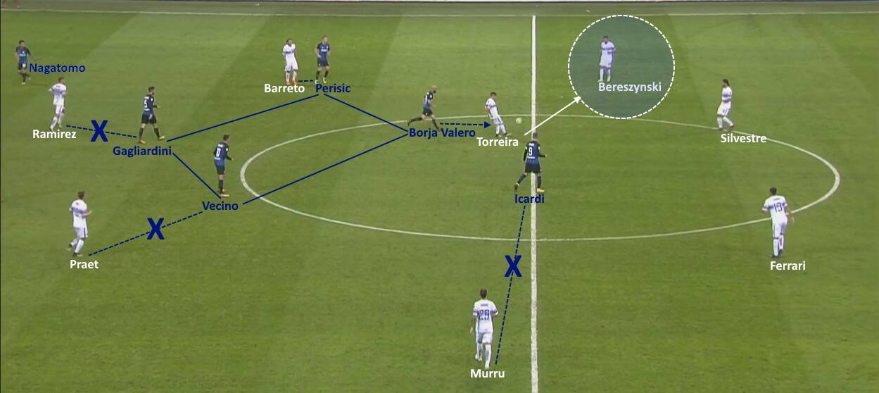 Nella partita di andata, Spalletti ha usato Perisic per pareggiare il rombo e ha orientato il possesso della Samp verso uno dei terzini, possibilmente quello sulla catena di destra, più debole qualitativamente