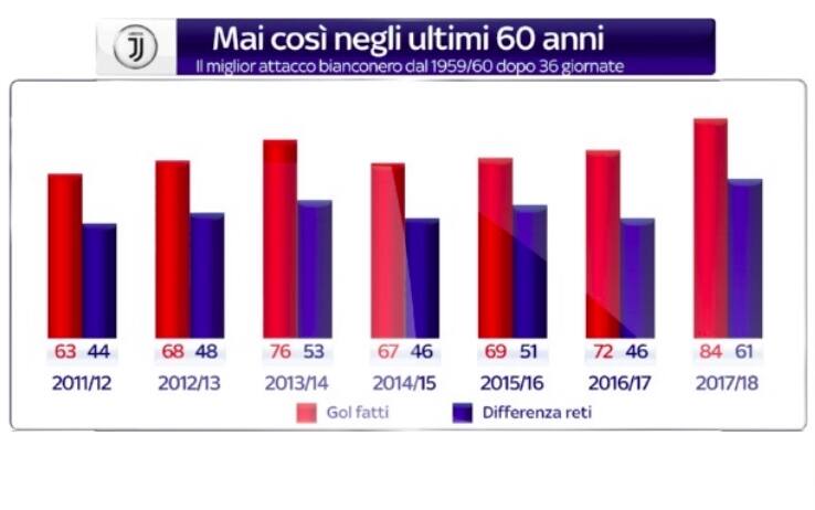 L’aritmetica non c’è ancora, ma è ormai impossibile che qualcuno privi la Juventus del suo settimo sigillo sul campionato. Dal 2011 con Conte fino al 20 maggio con Allegri, ma verosimilmente già il prossimo weekend all’Olimpico contro la Roma sarà festa tricolore, di nuovo. Nel segno ancora una volta della miglior difesa del campionato, come già da sette stagioni a questa parte, ma quest’anno anche grazie a un attacco che ha raddoppiato i giri del motore e alzato l’asticella dei record. Dybala e Higuain, ma anche Mandzukic, Douglas Costa, Cuadrado e Bernardeschi. I segreti di questa Juve sono proprio lì, dove uno dei suoi attaccanti - quasi inevitabilmente - riesce sempre a decidere la partita. Forse a turno, a volte tutti insieme, ma il gol non manca (quasi) mai, e non stupisce allora che le 84 reti registrate alla 36^ giornata (con un +61 di differenza gol) siano record storico per i bianconeri negli ultimi sessant’anni. Mai la Juve aveva infatti fatto così bene sotto porta, meglio dei 72 gol alla terzultima di campionato dell’anno scorso, e dei 76 allo stesso punto del 2013-14. Solo nella lontanissima stagione 1959-60, in un campionato che di partite totali ne contava solo 34, era arrivato un numero più alto, con 92 centri (e un +59 di differenza reti) fatto registrare da certi signori chiamati Giampiero Boniperti, John Charles e Omar Sivori, passati alla storia come Il Trio Magico.