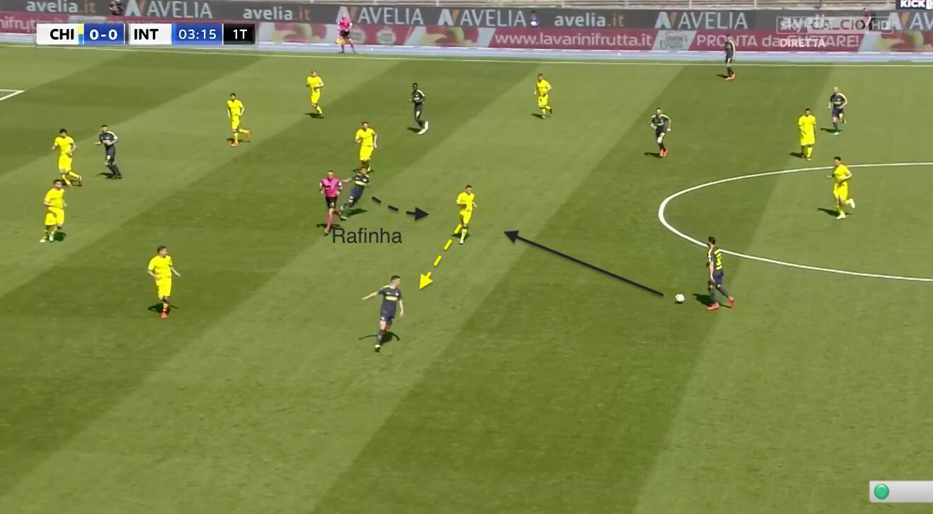 Rafinha viene spessp incontro al pallone, anche oltre il centrocampo, difficilmente quindi si può marcare a uomo (se non temporaneamente, in determinate situazioni) e dopo aver capito dove muoversi per ricevere con spazio, il brasiliano dell'Inter può sfruttare il controllo orientato per giocare la palla fronte alla porta e far avanzare la palla.
