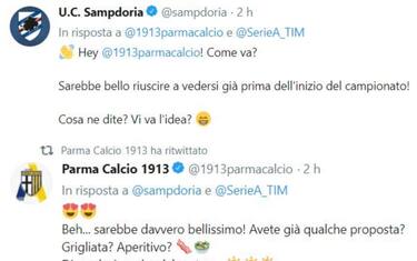 L’ultima gara in Serie A il Parma la giocò al Ferraris, uscendo tra gli applausi del pubblico seppur con tanta amarezza in cuore. Tre anni e tre promozioni dopo, la squadra gialloblu si è riconquistata con le unghie e con i denti quel prestigioso palcoscenico, ricordando sui social quei tristi momenti soppiantati adesso da gioia e felicità. L’avversario di allora era la Sampdoria, e quale buona occasione per organizzare una rimpatriata via Twitter? Il club doriano ha colto la palla al balzo, ricambiando il saluto social del Parma e invitandolo ad organizzare qualcosa prima dell’inizio della Serie A: "Sarebbe bello riuscire a vedersi già prima dell'inizio del campionato! Cosa ne dite, vi va l’idea?". Tra un aperitivo e una grigliata, la scelta è caduta su una partita amichevole, da giocare però in uno stadio 'prenotato' dal Parma: "Possiamo ritrovarci in campo, magari per un'amichevole! Dateci il tempo di metterci in forma però. Dove ci vediamo? E soprattutto: chi prenota il campo? Hai il numero?" la richiesta della Samp, che non ha trovato impreparati gli emiliani. "Ok, il campo lo prenotiamo noi! Il pallone della Serie A Tim non ci è ancora arrivato, lo portate voi?". "Sì, sì – la replica del club doriano sempre su twitter - diamo un'occhiata in magazzino ma dovremmo averlo. Ci sentiamo dopo, così la ufficializziamo".