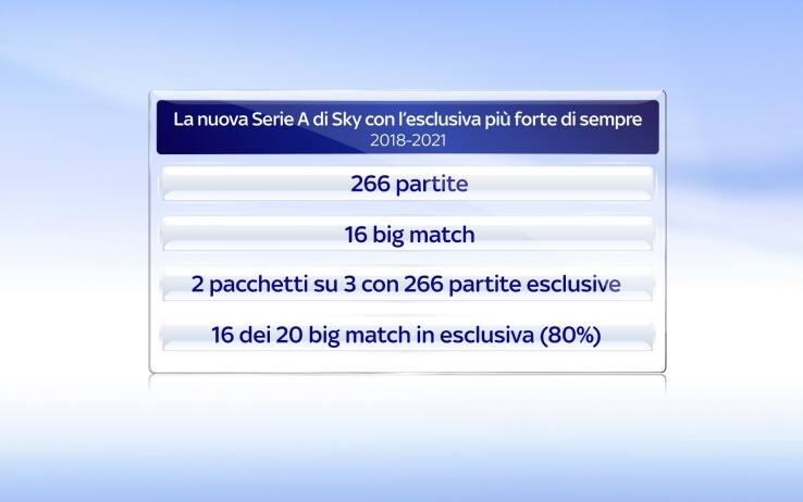 La Serie A sarà su Sky con un'offerta mai così esclusiva. Non solo, l'offerta migliore che potessimo offrire ai nostri abbonati. Impossibile fare di più, per la struttura dei pacchetti venduti ed anche per legge. Le regole dell'ultimo bando definito dalla Lega Calcio hanno optato per un nuovo sistema di assegnazione dei diritti televisivi, già utilizzato dai campionati più importanti d'Europa, ma mai prima in Italia. Tre pacchetti in vendita in relazione alle fasce orarie dei match, con partite suddivise su tre giorni, agli orari stabiliti sempre dalla Lega.