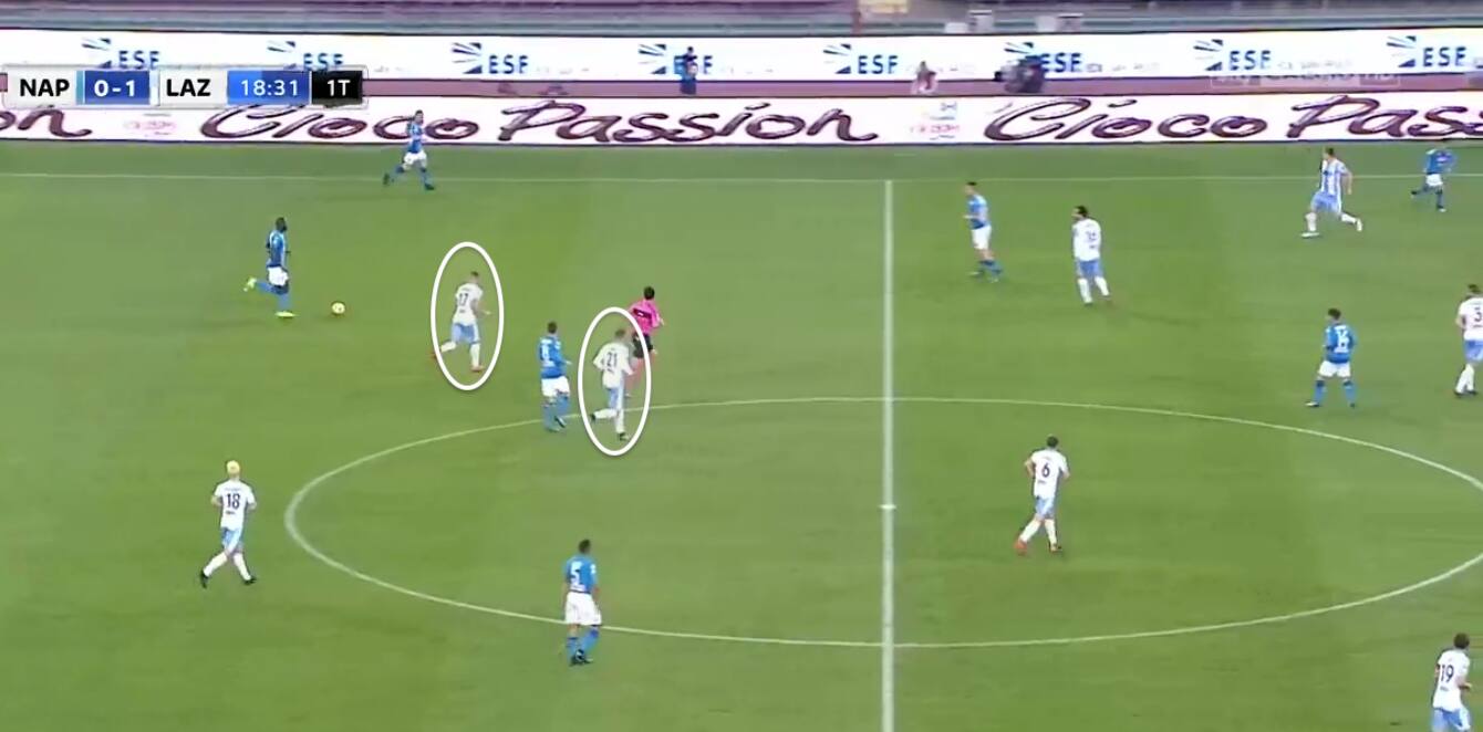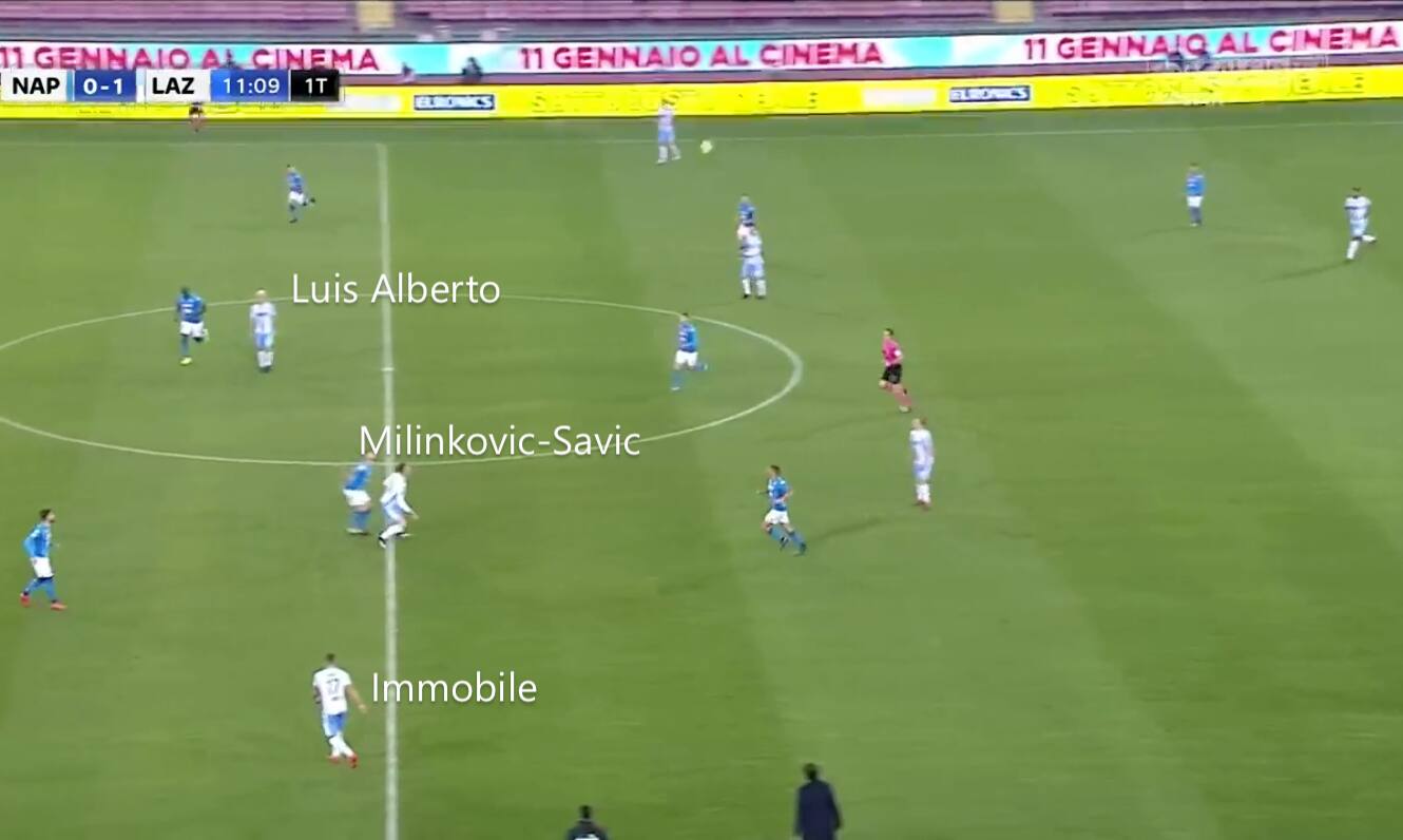 Sul lancio lungo dalla difesa, Luis Alberto si posiziona al centro, mentre Immobile è largo, pronto ad approfittare dello spazio liberato dal centrale Tonelli, uscito dalla linea per ingaggiare un duello aereo con Milinkovic-Savic