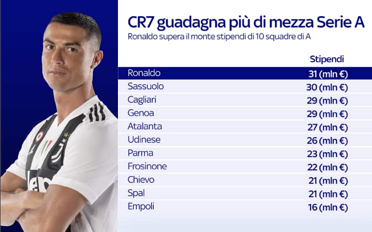 I 31 milioni di euro netti versati dalla Juventus al suo n°7 superano quanto speso da ben 10 squadre del campionato italiano per tutta la rosa: l'Empoli al lordo investe la metà di quanto finisce nelle tasche di Ronaldo