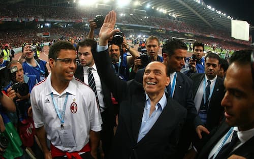 Giro d'onore per Berlusconi allo stadio di Atene, accompagnato dal nuovo acquisto Ronaldo, il Fenomeno