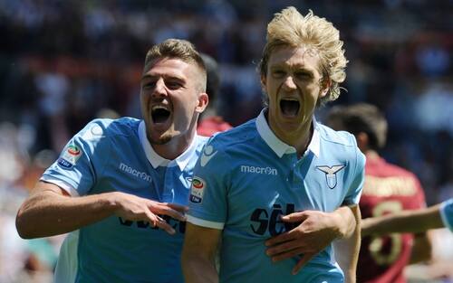 Milinkovic-Savic decide due derby di Coppa Italia nel 2017. Per festeggiare il centrocampista serbo indica lo scudetto della Lazio cucito sul petto -