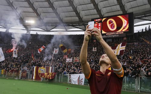 La genialità di Francesco Totti nel selfie sotto la Sud dopo il gol del pareggio nel derby dell’11 gennaio 2015 –