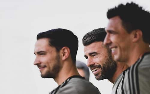 Momento relax alla Continassa al termine dell’allenamento: De Sciglio, Barzagli e Mandzukic osservano compiaciuti i compagni impegnati nelle ultime fasi della seduta odierna (Ph juventus.com)