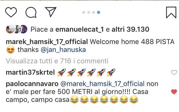 Tra i vari commenti al post, poi, è spuntato anche quello dell'amico ed ex-compagno di squadra Paolo Cannavaro (oggi in Cina, collaboratore del fratello Paolo), che l'ha simpaticamente preso in giro facendogli notare come la Ferrari sia un po' esagerata per recarsi al campo d'allenamento, praticamente a due passi da casa: "Non è male per fare 500 metri al giorno: casa, campo, campo, casa!".